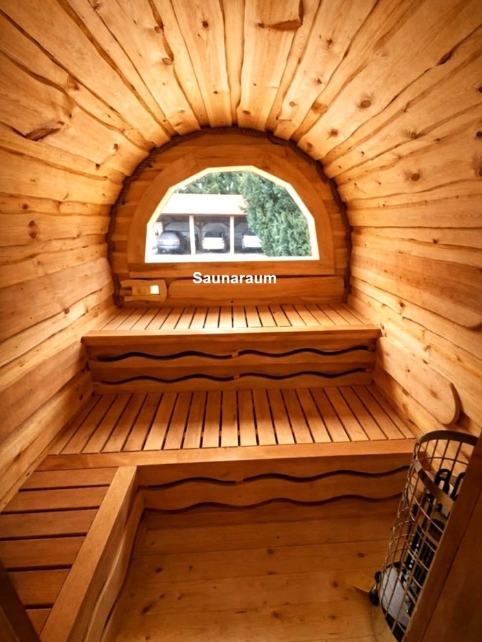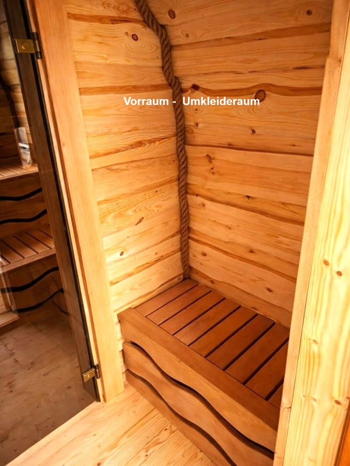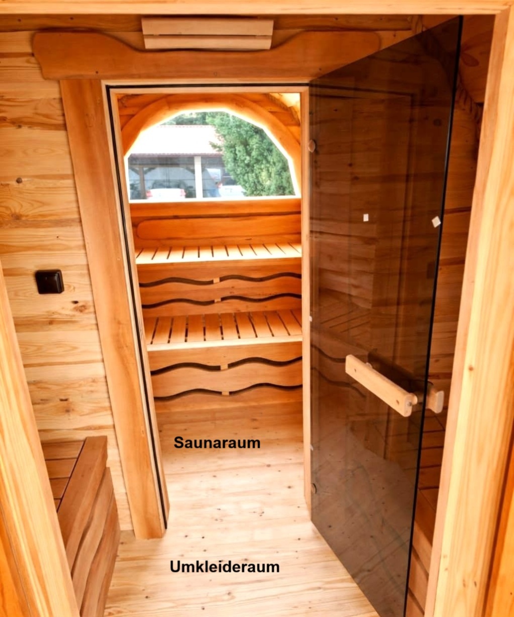 Exklusive Gartensauna aus Kieferholz. Innenraum & Saunabänken aus Erlenholz – langlebig, stabil und ideal für die entspannte Saunagänge im eigenen Garten.
